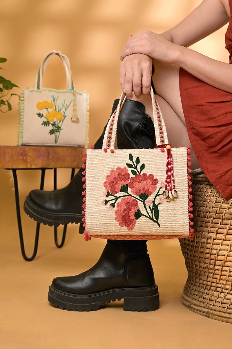 Bursting with vibrant charm with our Coral Bloom Mini Tote, this tote features beautiful coral floral embroidery and playful pom-pom trim. Its sturdy woven handles and a delightful tassel with a natural shell add a touch of bohemian flair. Don't let its size fool you—a secure main compartment and a discreet inside zip pocket keep your essentials safe. It's the perfect accessory to brighten any day!