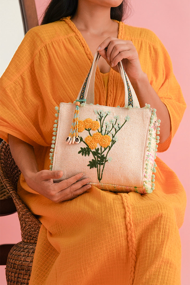 Introducing the Marigold Mini Tote Bag! your perfect companion for adding a touch of bohemian flair to any outfit. The yellow floral embroidery evokes a feeling of sunshine and joy, while whimsical mint-green pom-poms add a fun, flirty touch. A detachable tassel, in shades of teal and yellow and accented with a shell, adds a unique coastal-inspired detail. Inside, a convenient zip pocket keeps your small essentials secure. It's the perfect blend of style and practicality for the modern free spirit.