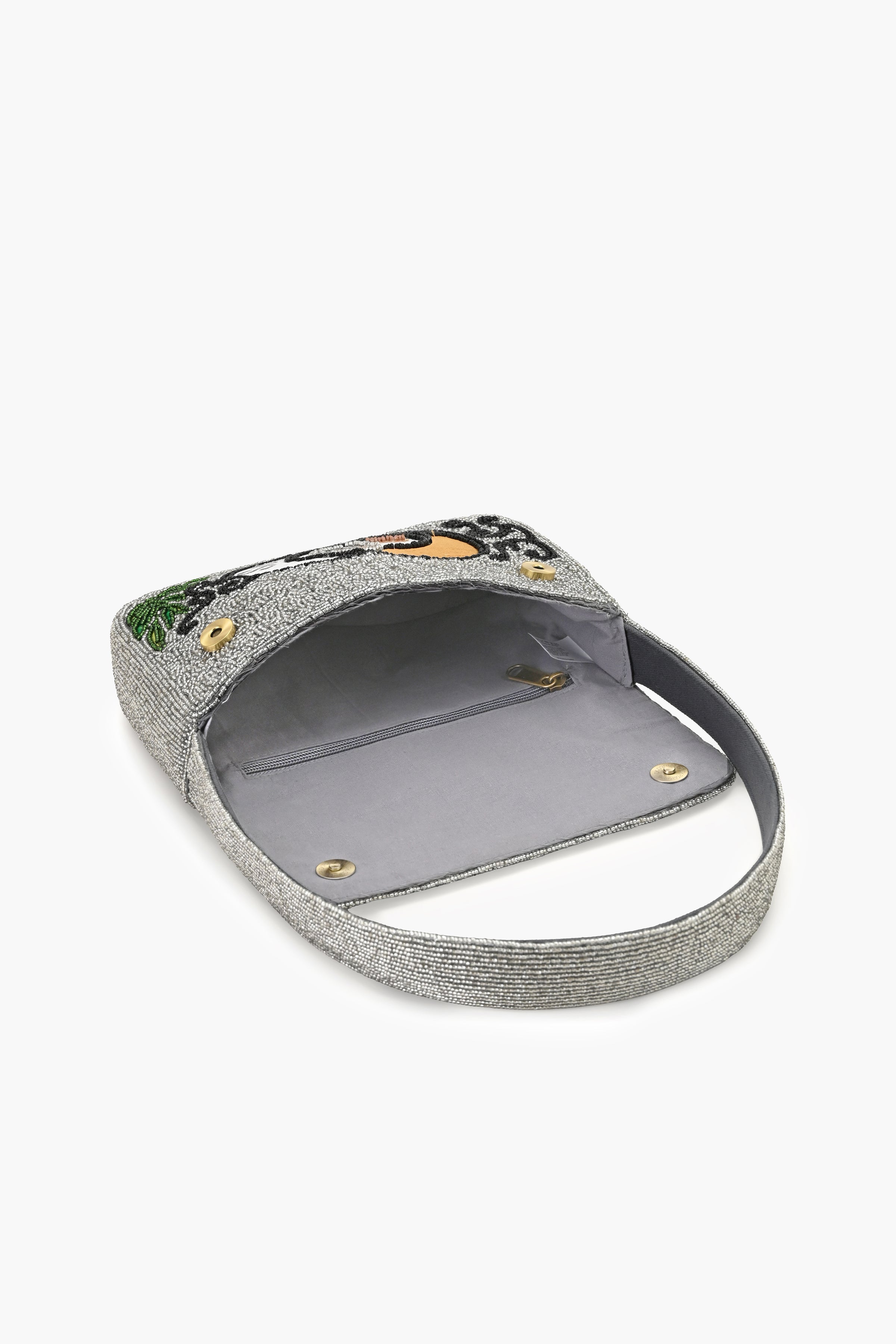 This stunning bag features a detailed hand-beaded illustration of a classic Parisian and floral vines set against a shimmering silver base. Meticulously crafted for the modern woman, it combines artistic flair with functional design. Whether it's a brunch, a wedding, or a dinner date, this fully beaded bag is your perfect statement accessory.