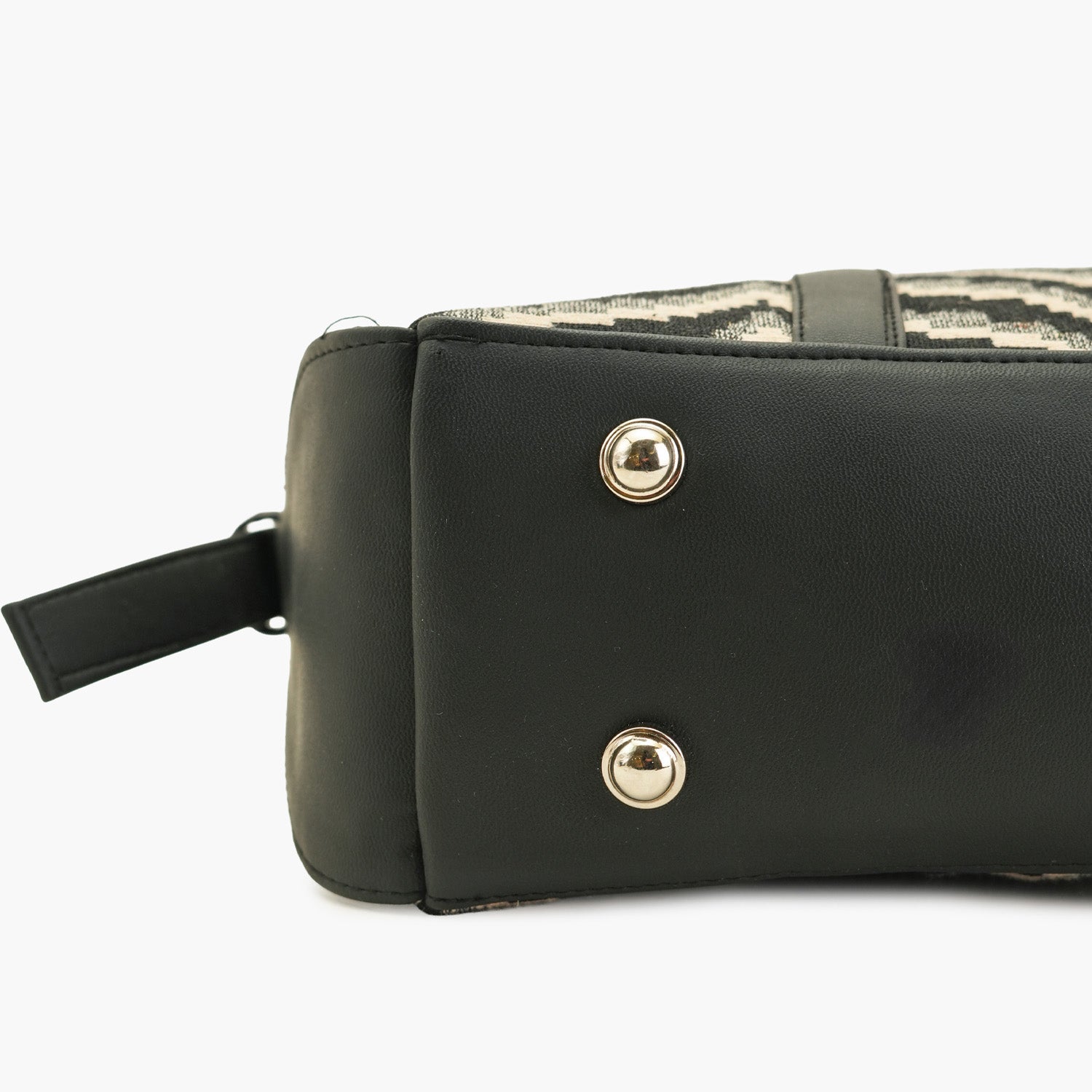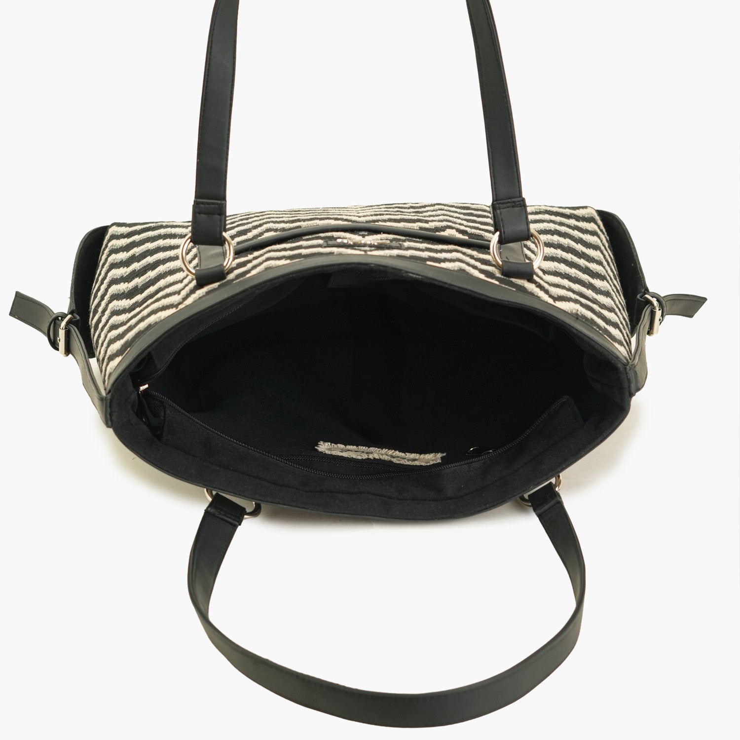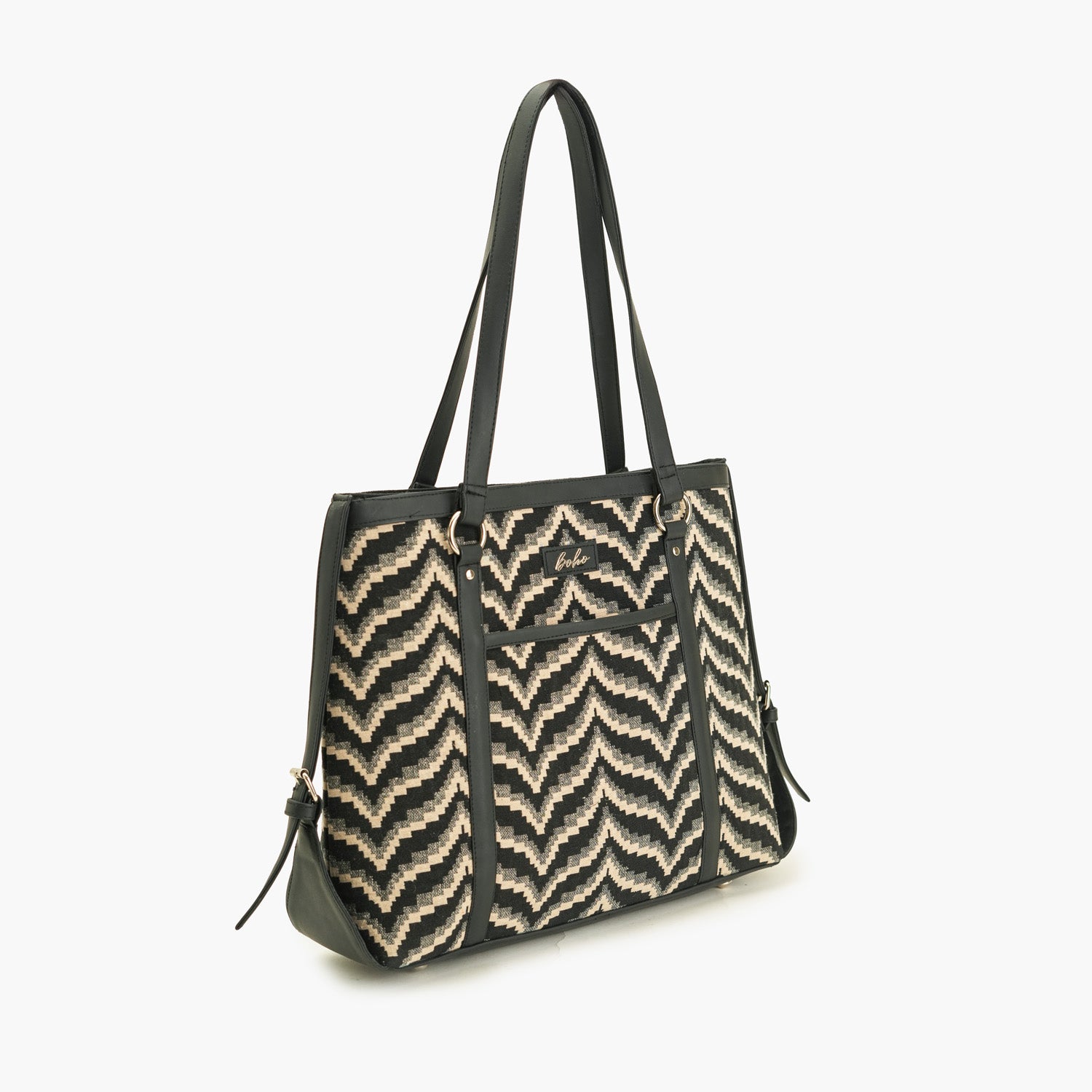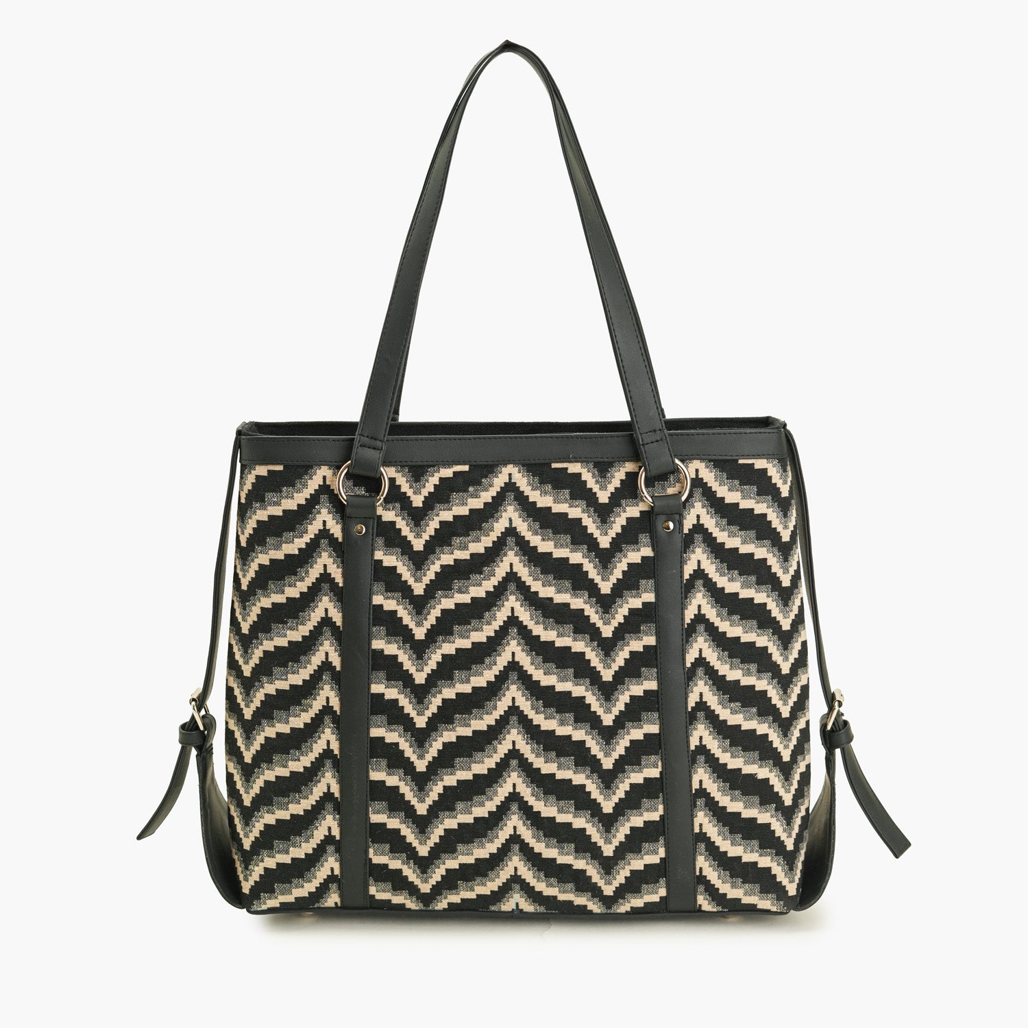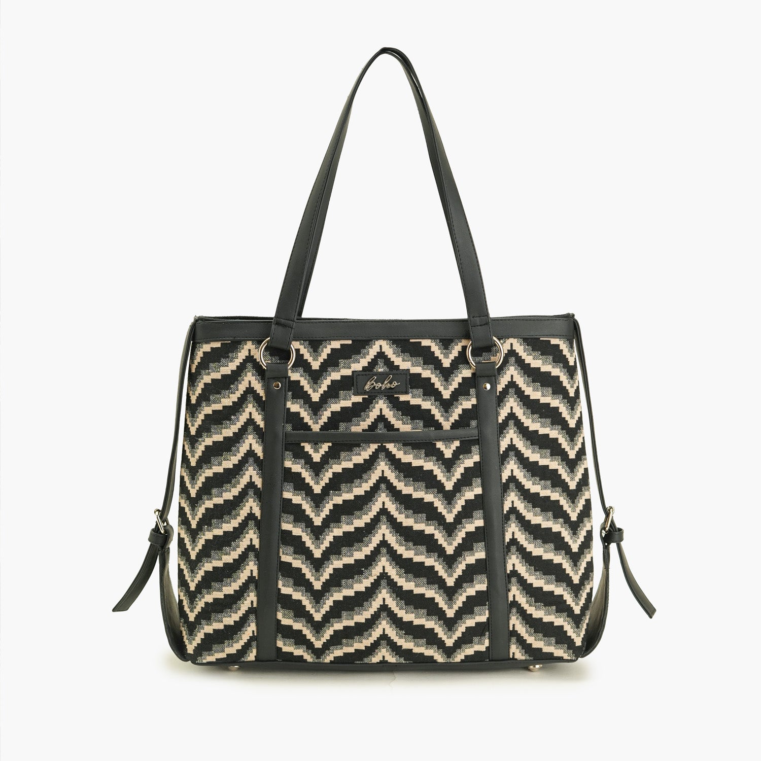 Experience the perfect blend of elegance and utility with the Bohogirl Jacquard Chevron Tote Bag. This bag is specially designed for the modern professional who needs to carry their world in style. Featuring a striking black and beige zigzag pattern, it is complemented by rich Black vegan leather trims that add a sophisticated touch.