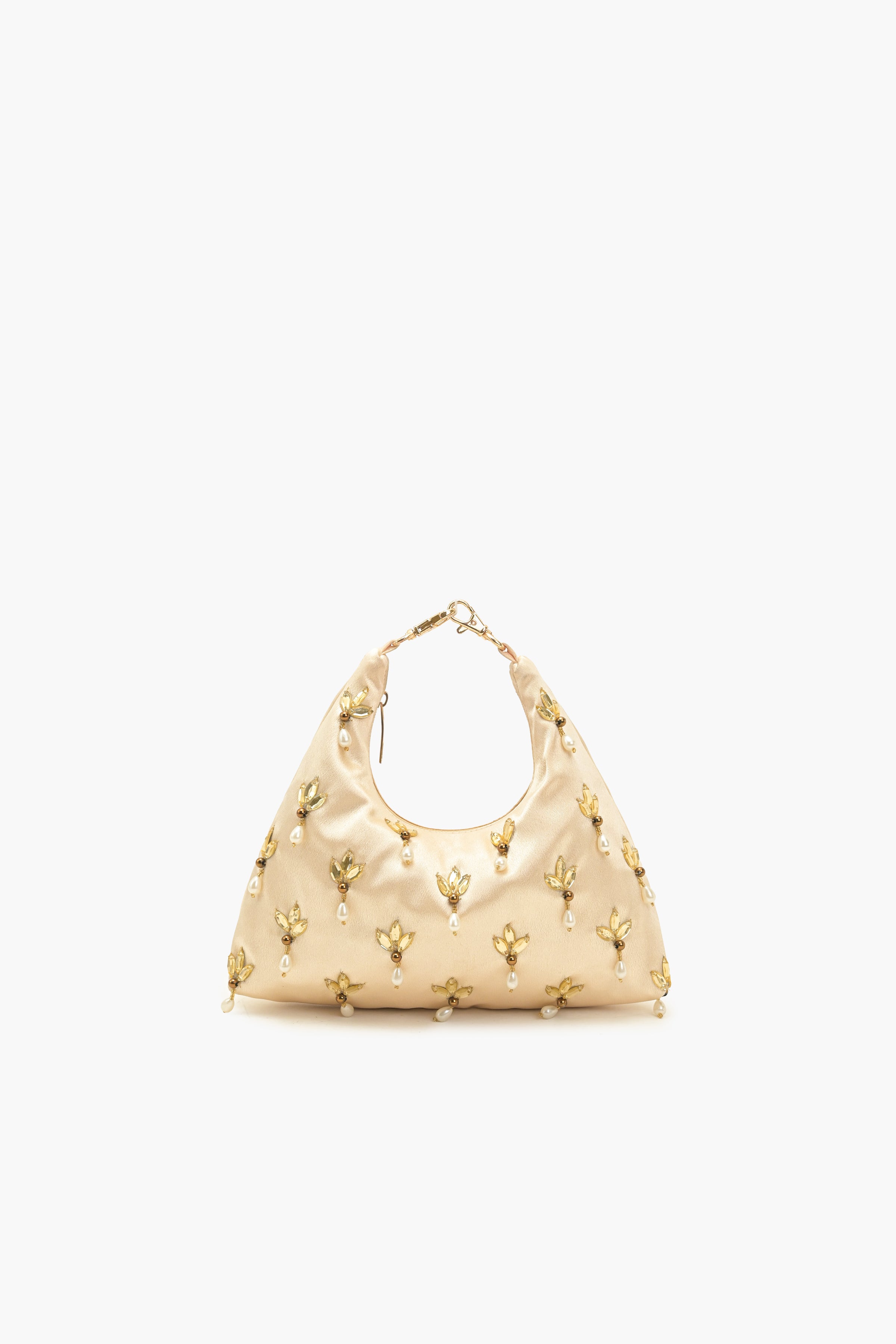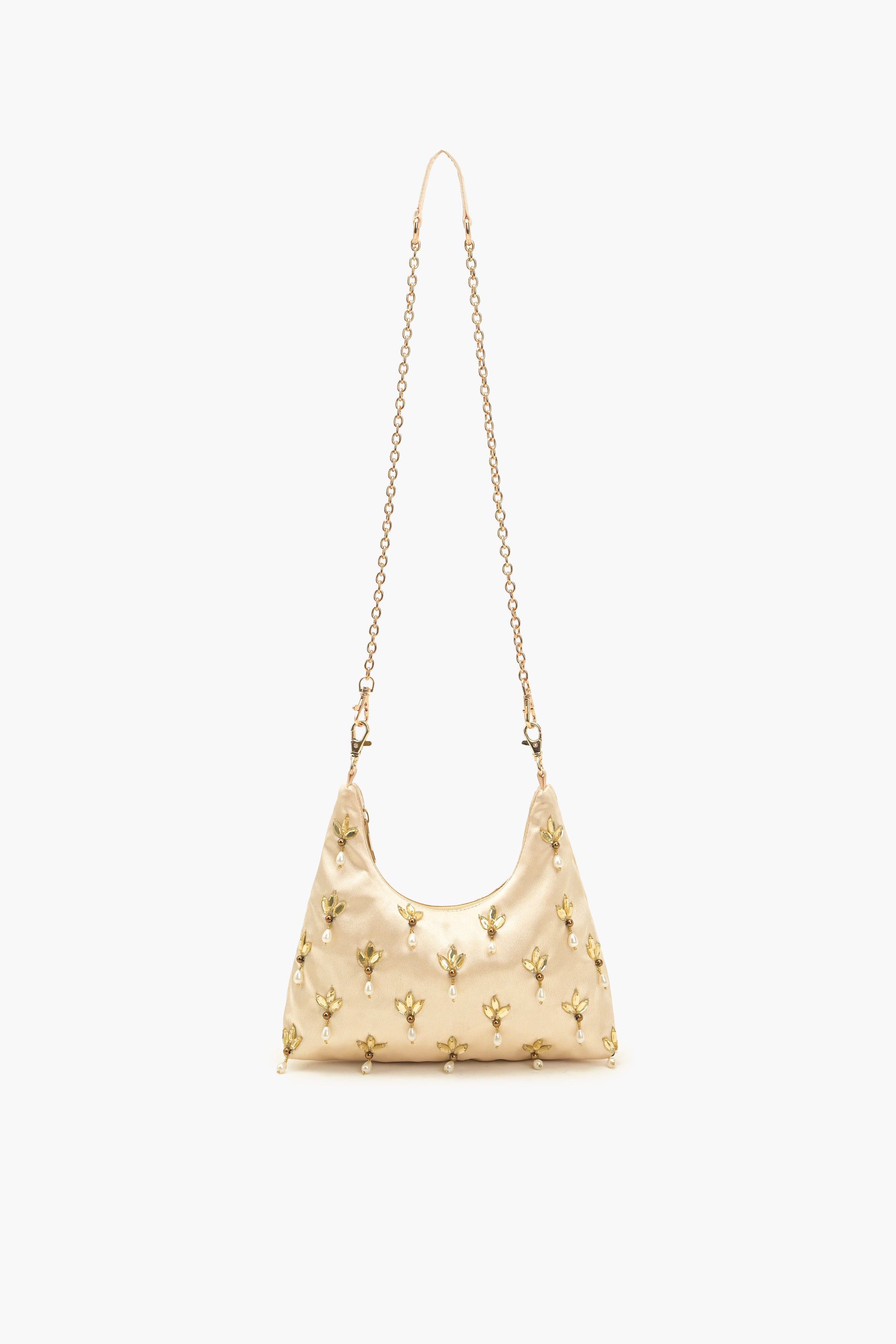 Step into the festive season with grace and grandeur with our Regalia Pearl Embellished Handbag. Its crafted with lustrous champagne-gold satin base adorned with exquisite hand-embellished floral motifs each accentuated with delicate dangling pearls - making it a perfect companion for weddings, festive soirees and evening celebrations. The crescent silhouette gives the bag a contemporary touch, while the statement handle ensures a comfortable yet stylish grip. A subtle metallic clasp adds refinement, balancing beauty with functionality.