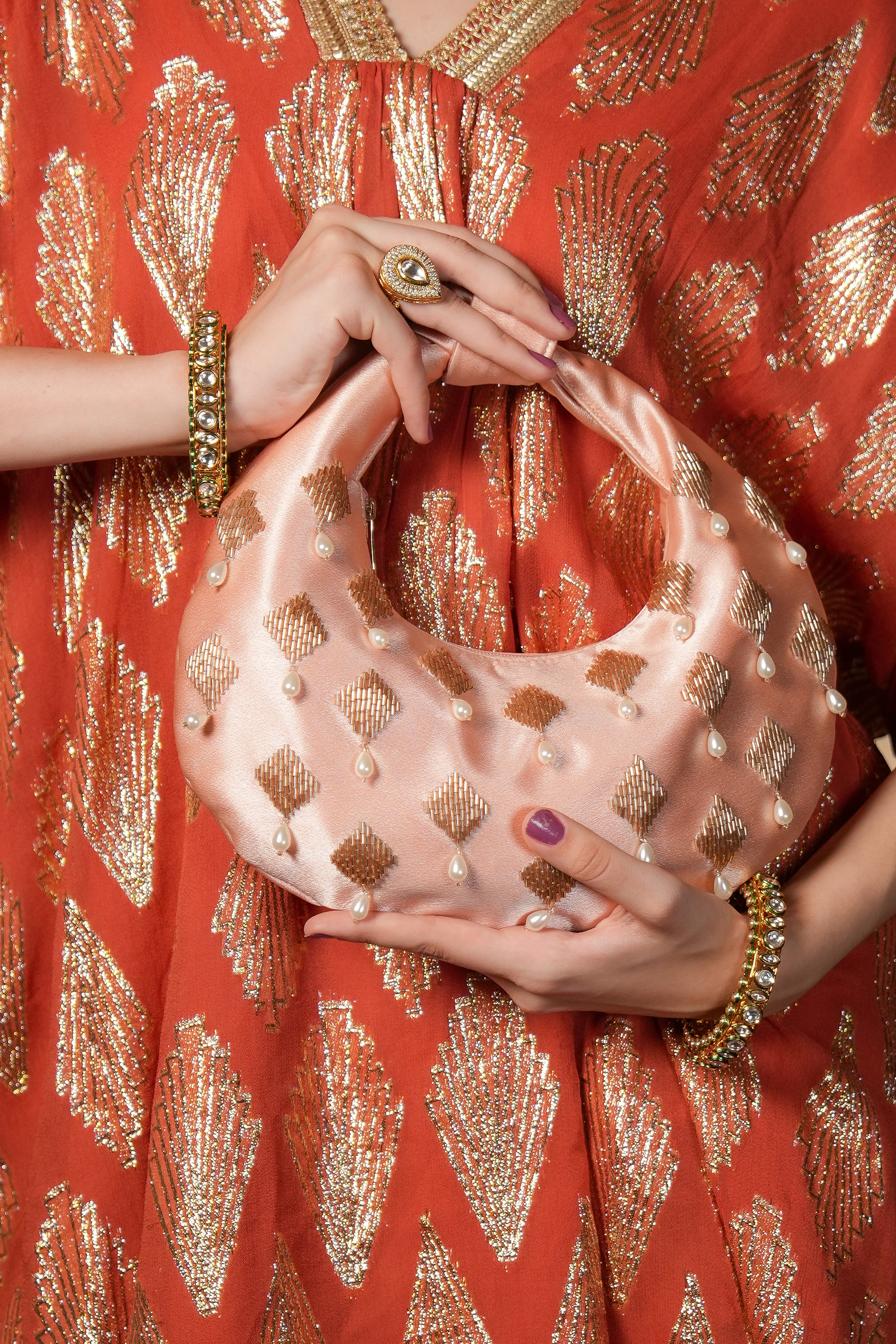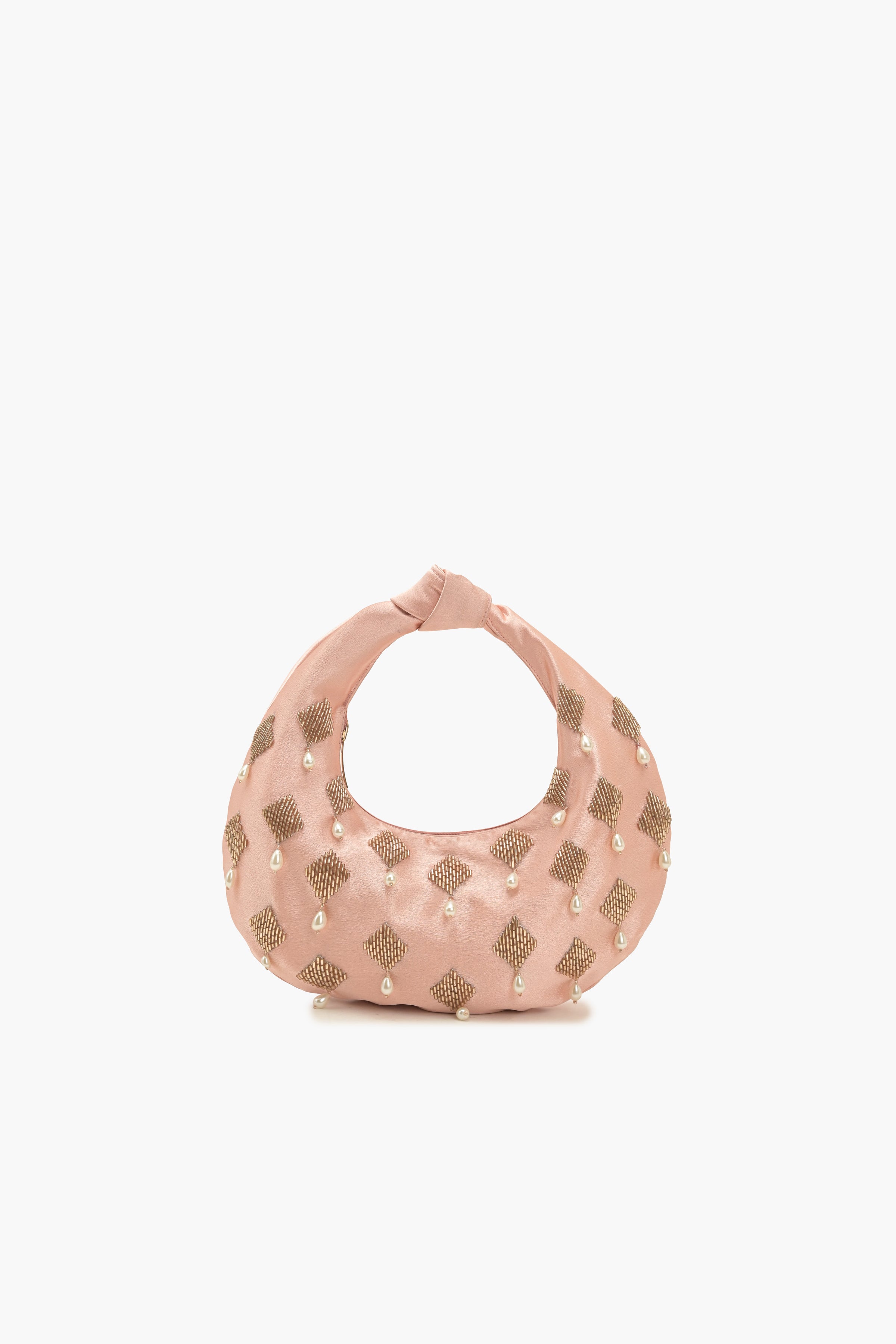 Step into the festivities with timeless elegance with The Royale Blush Handbag. This women handbag crafted in a delicate blush pink satin finish - The highlight of this piece lies in its exquisite diamond-patterned metallic detailing paired with dainty pearl droplet accents creating a mesmerizing play of light and movement. Its knotted handle adds a charming handcrafted appeal, making it easy to carry from day rituals to evening soirées.
