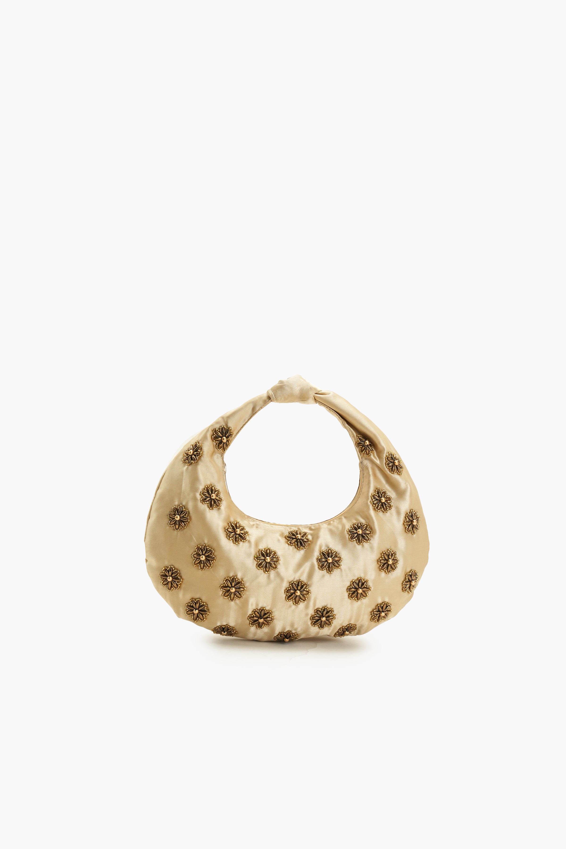Step into the season of celebrations with Our Shah-Noor Embellished Handbag- a timeless piece from our exclusive Festive Collection. Crafted in a rich champagne-gold hue adorned with meticulously hand-embroidered floral motifs in antique gold, each embellished with intricate beadwork, radiating a regal charm. Its crescent-shaped silhouette and the knotted handle adds a modern twist to classic festive styling.
