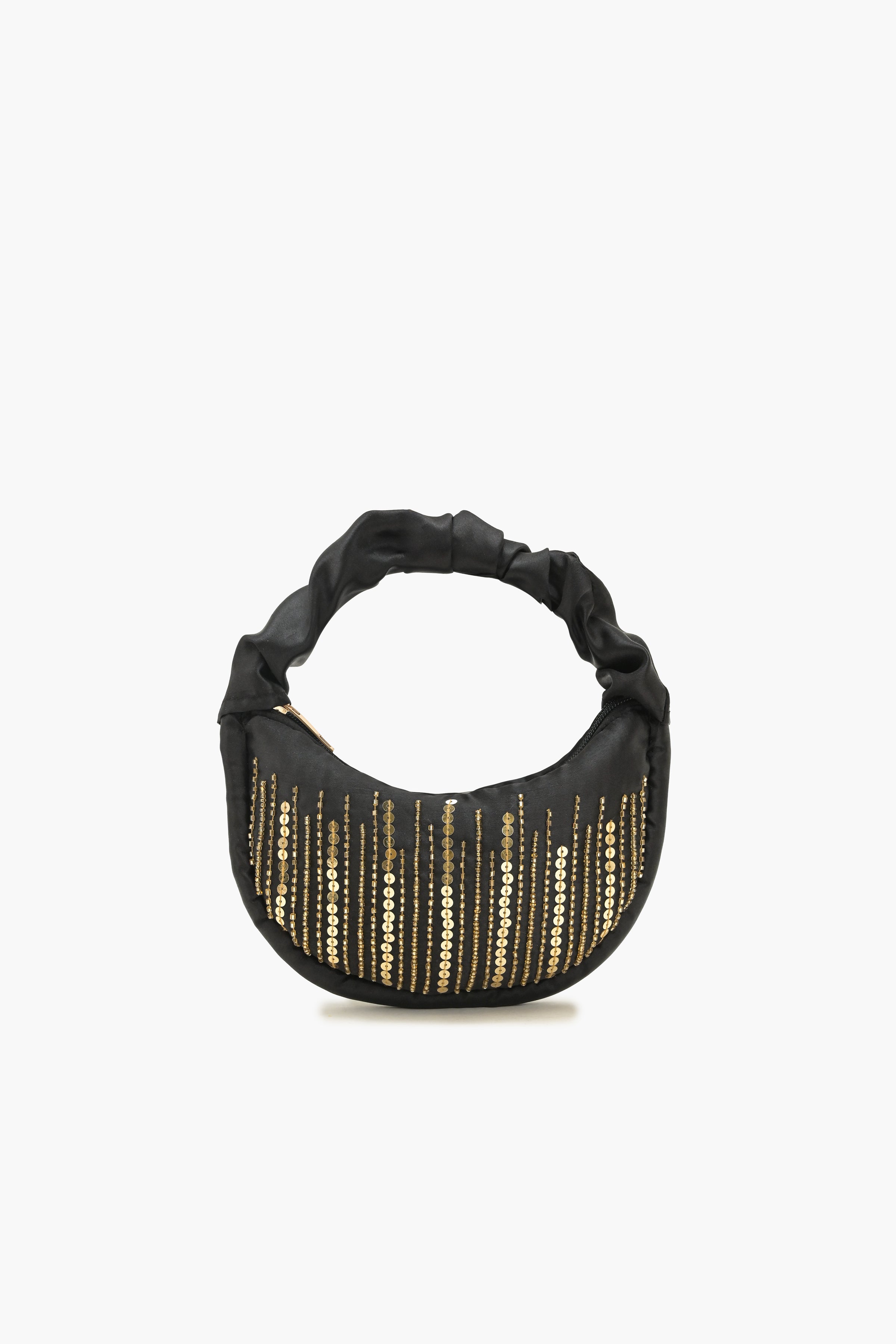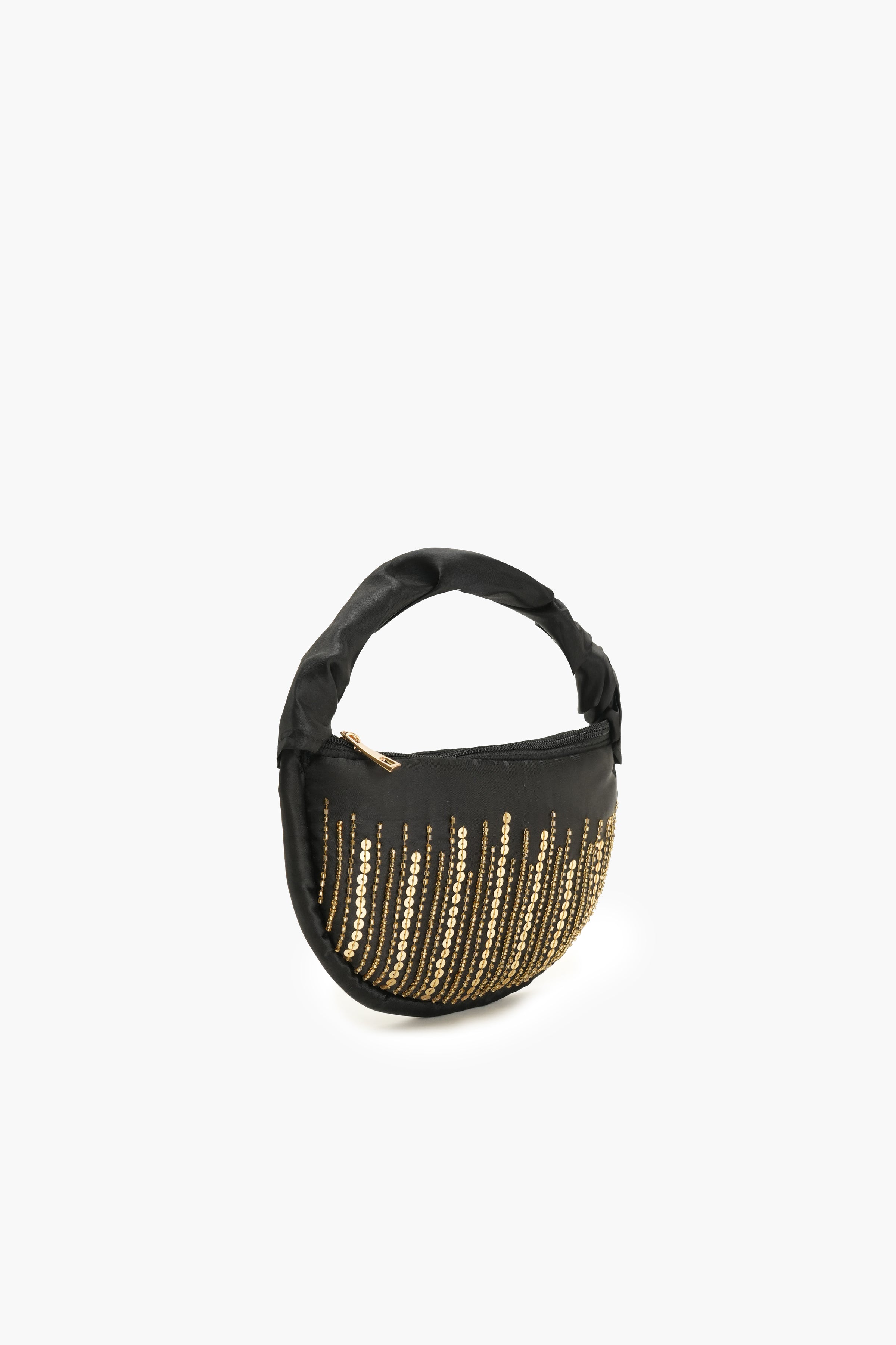 From our festive edit comes the Siyaara Embellished Handbag - Designed in a bold black satin base adorned with cascading vertical lines of golden sequins, reminiscent of glistening lights against a midnight sky. Our crescent-shaped women handbag with ruched handle exudes contemporary elegance and playful sophistication. Our embellished women handbag is a perfect companion for soirées, festive evenings or weddings.