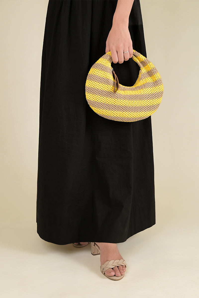 Embrace the warmth of summer with the Sunshine Coast Handbag - designed to brighten your every outfit. This bag captivates with its eye catching horizontal striped design in a combination of sunny yellow and natural beige. Crafted from beautifully textured raffia - Its aesthetic knot detail on the handle not only giving it a Focal Point, Also giving the bag a relaxed yet sophisticated silhouette. The Faux Leather puller tie on the zip, offering a refined finish. Perfect for a day out, a casual evening, or your next vacation.