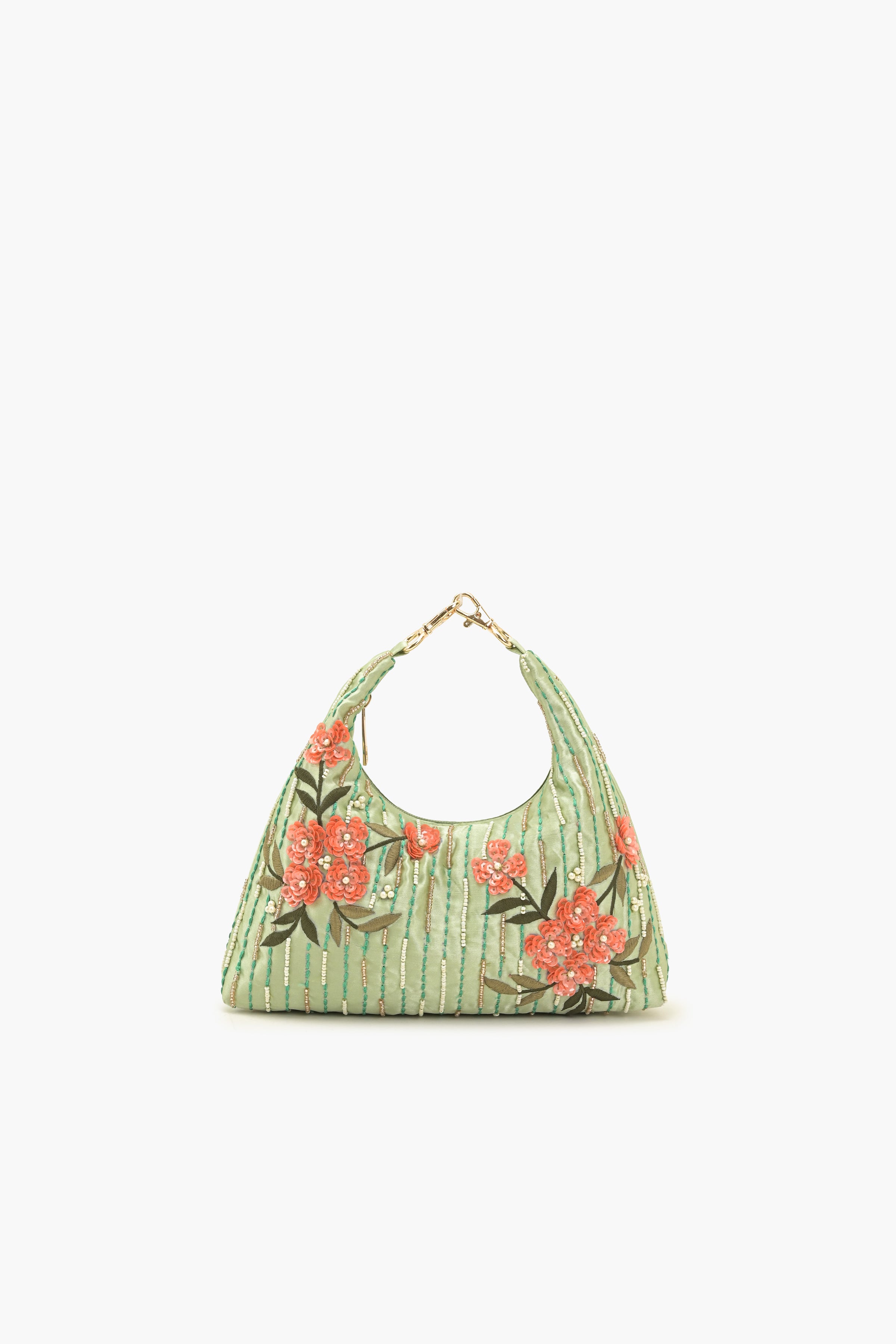 Step into the spotlight and command every gaze with our most coveted creation from the Festive Collection. Our Regal Floral Handbag is designed for the modern day queen a true jewel that completes your festive look with a touch of grandeur. The green satin base with captivating floral motif brought to life with vibrant coral pink threadwork forming the petals. The exquisite hand embellishment creating a mesmerizing effect along with the vibrant floral design ensuring you carry a unique piece of artistry with you.