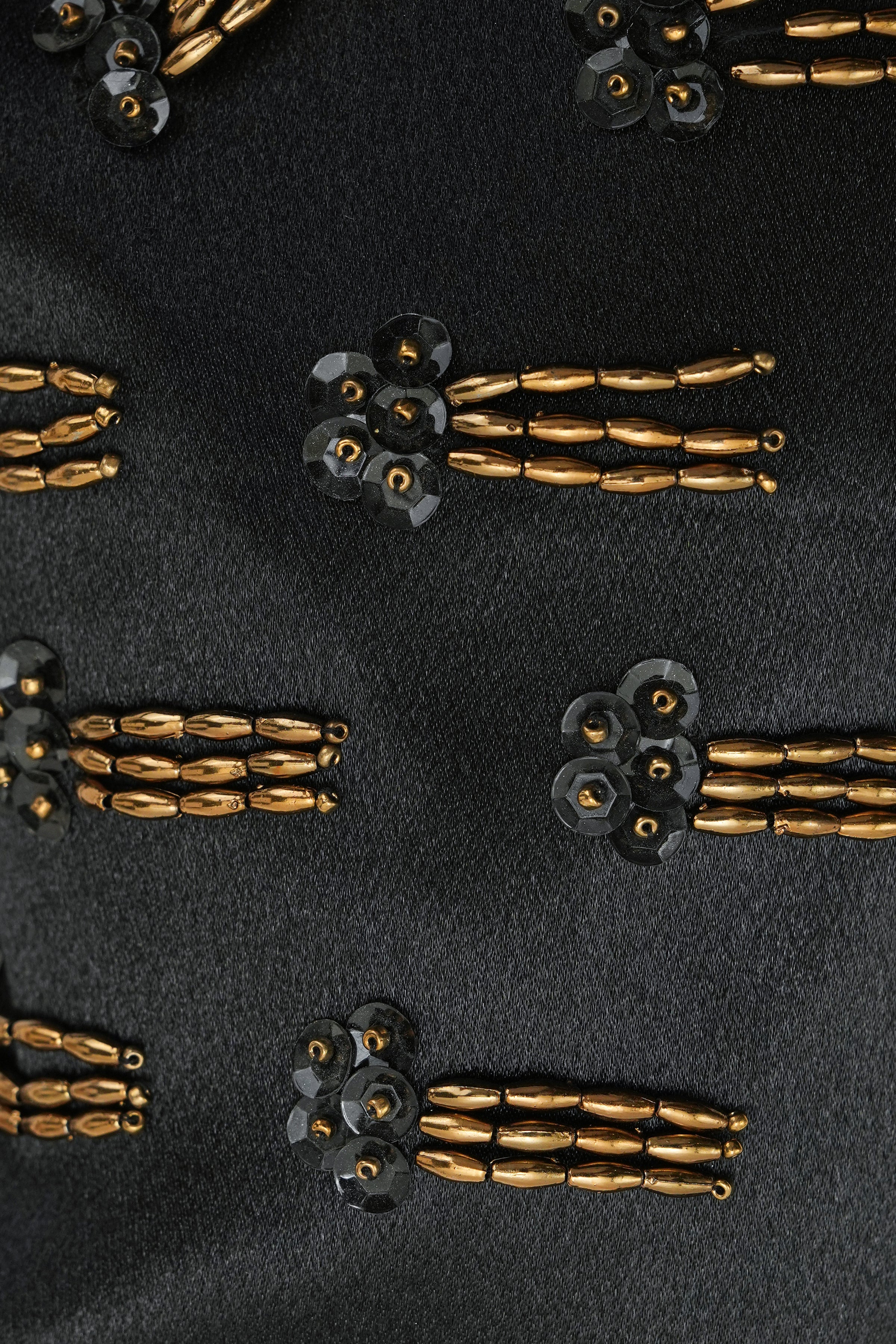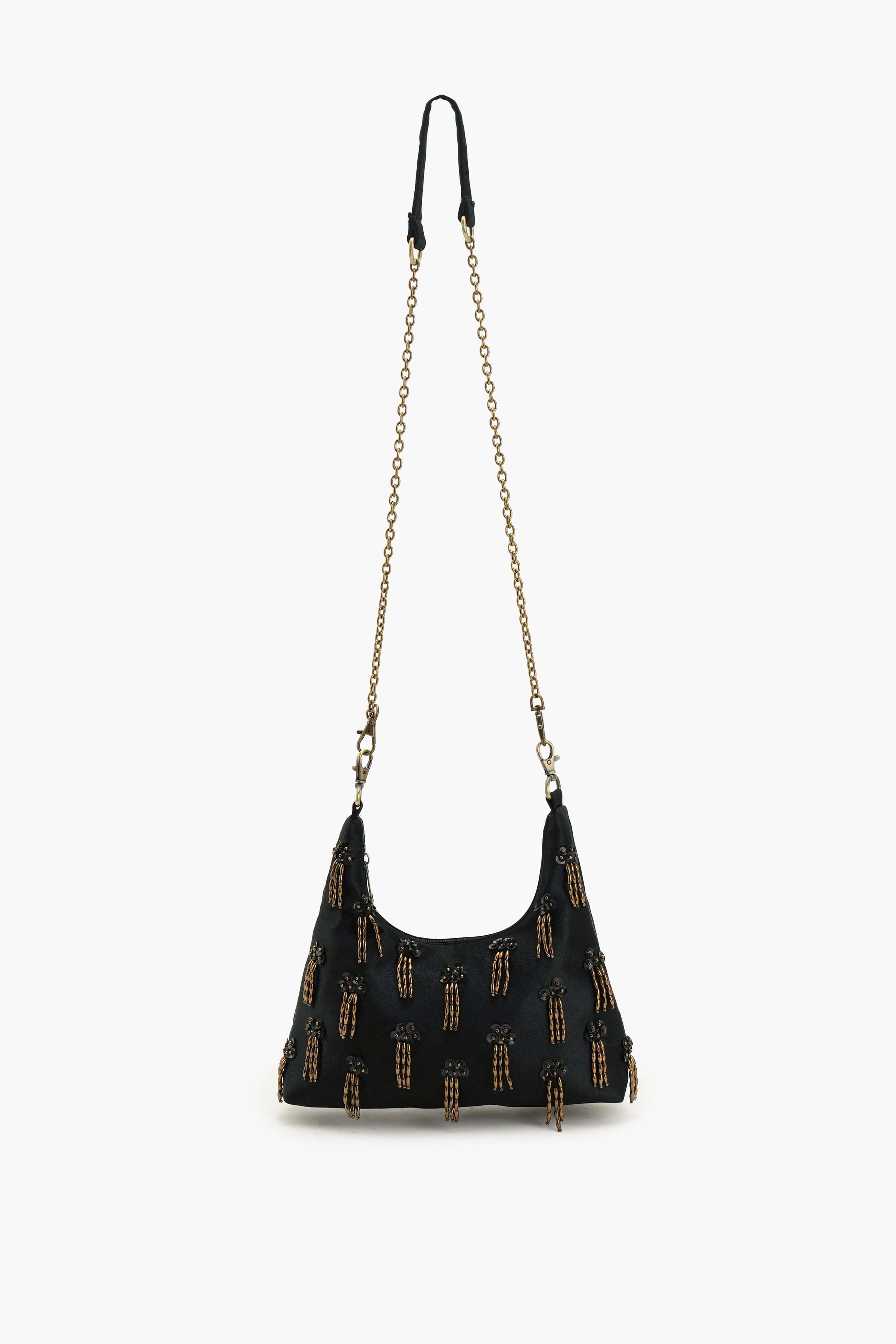 Meet Our The Royal Eclipse Handbag from our festive edit - designed for those who appreciate refined luxury and a touch of dramatic flair. Its Crafted from rich black base fabric with meticulously arranged gilded tassels hand-embellished with exquisite detail. Hese tassels are thoughtfully placed across the bag's surface, creating a dynamic, opulent texture. Its refined design perfectly complements the bag's overall regal aesthetic making it a companion for your most celebrated occasions.