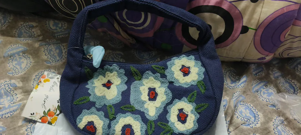 Elevate your accessory game with our captivating Indigo Blossom Handbag. This unique handbag boasts a rich deep navy body, serving as a luxurious backdrop for beautifully embroidered large floral motifs in azure and cream. Complemented by an elegant crescent silhouette, a comfortable padded handle, and a delicate light blue ribbon, this bag is perfect for adding a touch of refined artistry to any outfit, from brunch to an evening out.