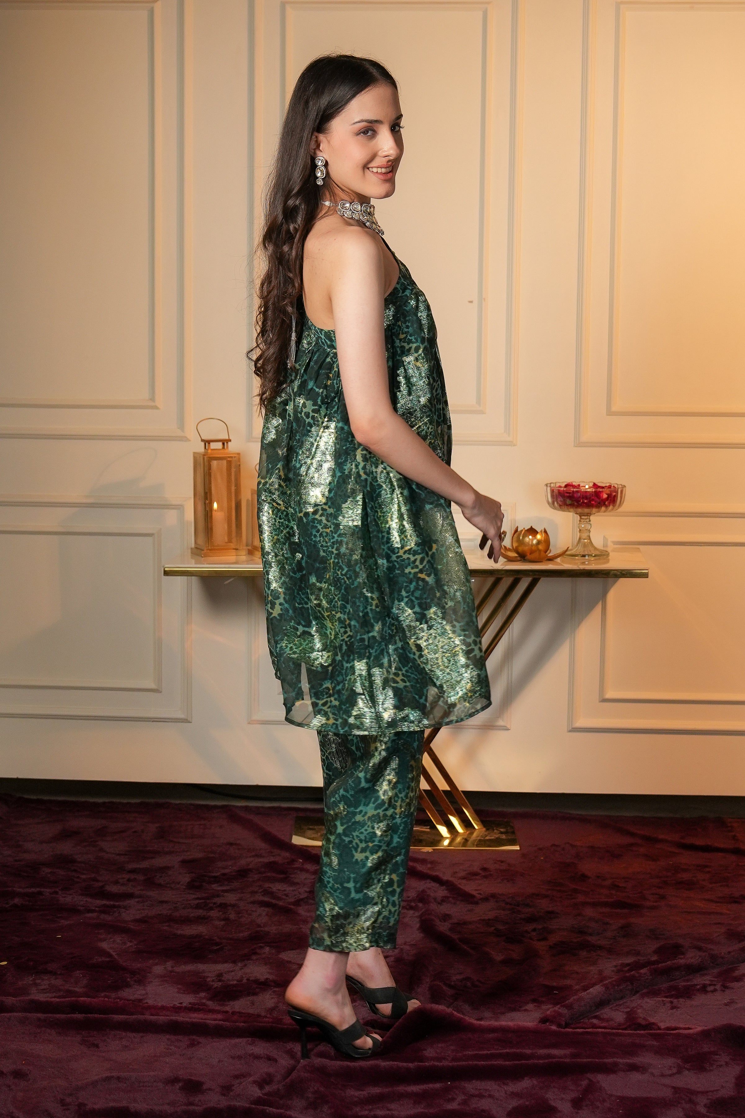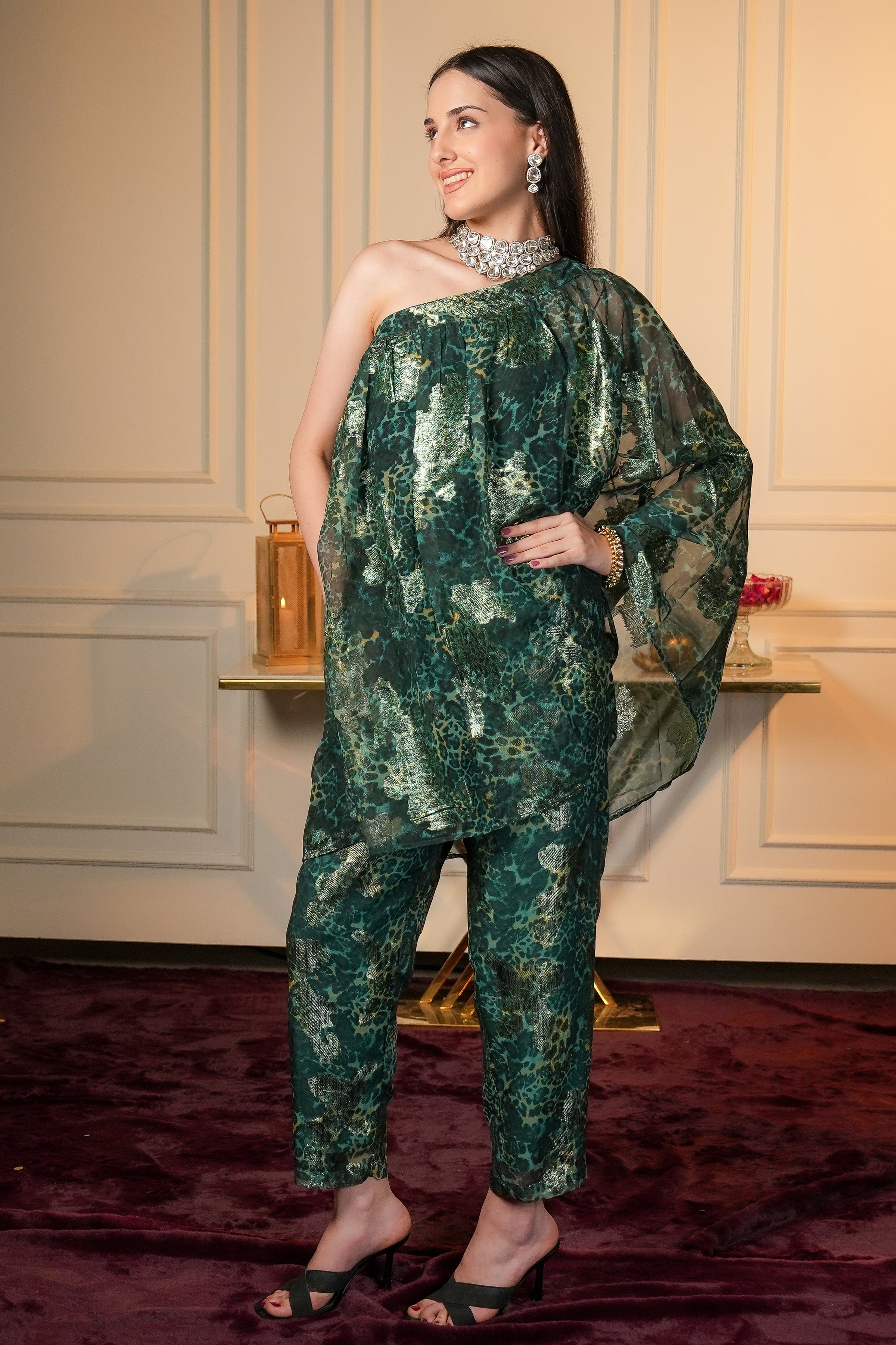 Step into the spotlight this festive season with our Zelva green boho indo western coord set - Designed in a rich jewel-toned green base with golden accents, this ensemble reflects both sophistication and festive grandeur. The one-shoulder flared top features high-low hemline that drapes beautifully, adding drama to your look. Fully lined for comfort, it pairs seamlessly with straight pants tailored with a front belt and back elasticated waistband, ensuring a flattering fit. Our Women green co-ord set perfect for festive evenings, intimate gatherings, and celebrations where you want to shine with understated glamour.