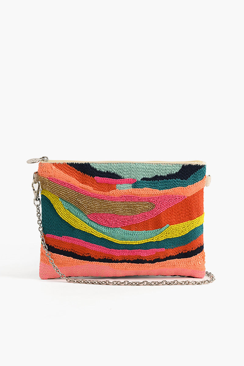 Introducing the vibrant Colorful Rainbow Embellished Clutch, hand-beaded and embroidered in Teal, Pink, Coral, and sparkling Gold, this showstopper showcases intricate craftsmanship.