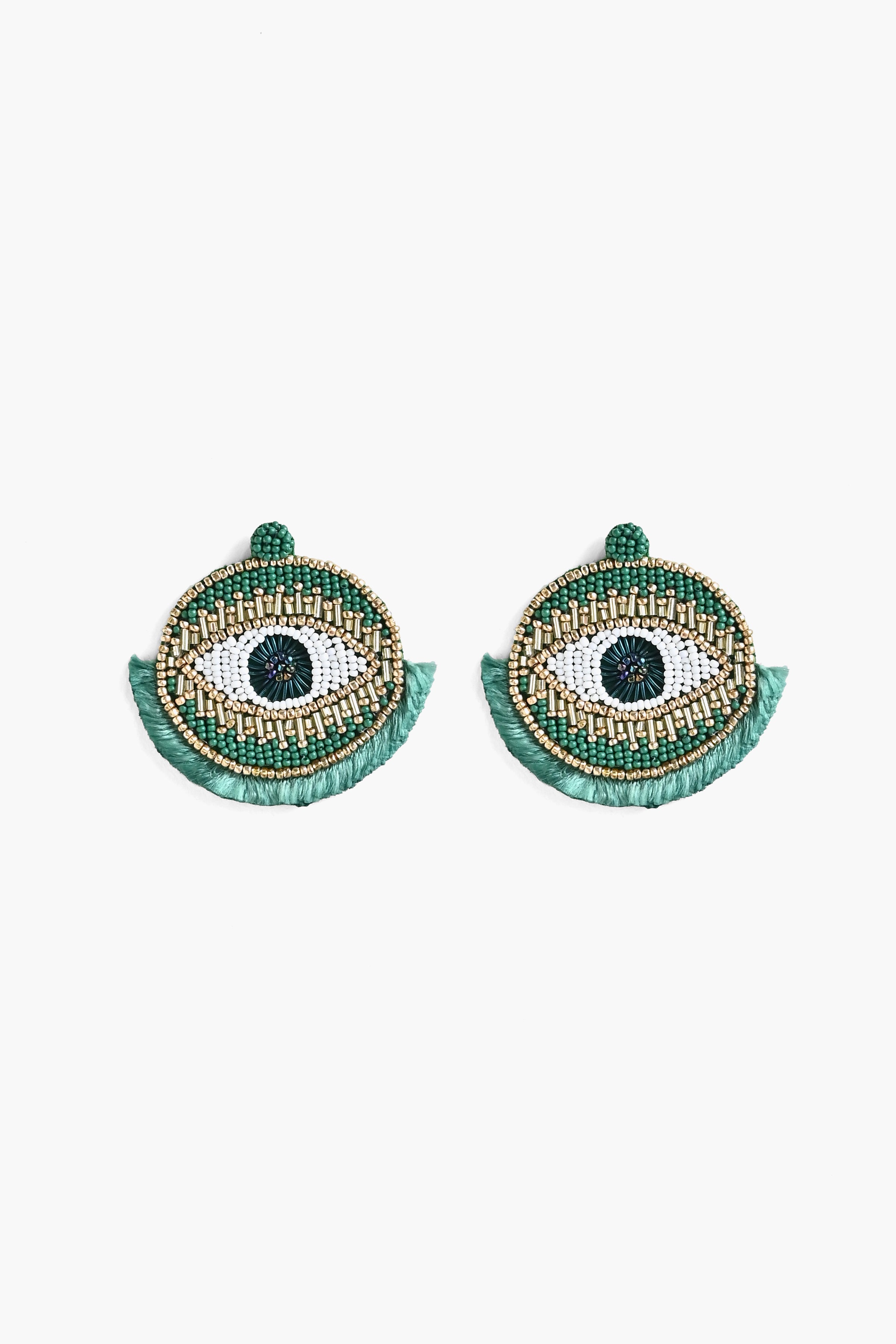 Elevate your style with Bohogirl’s Green Evil Eye Beaded Earrings. These handcrafted drops feature a detailed circular eye design paired with soft teal fan tassels. Combining traditional protection symbols with a modern bohemian aesthetic, these lightweight earrings are the perfect statement piece for any occasion.