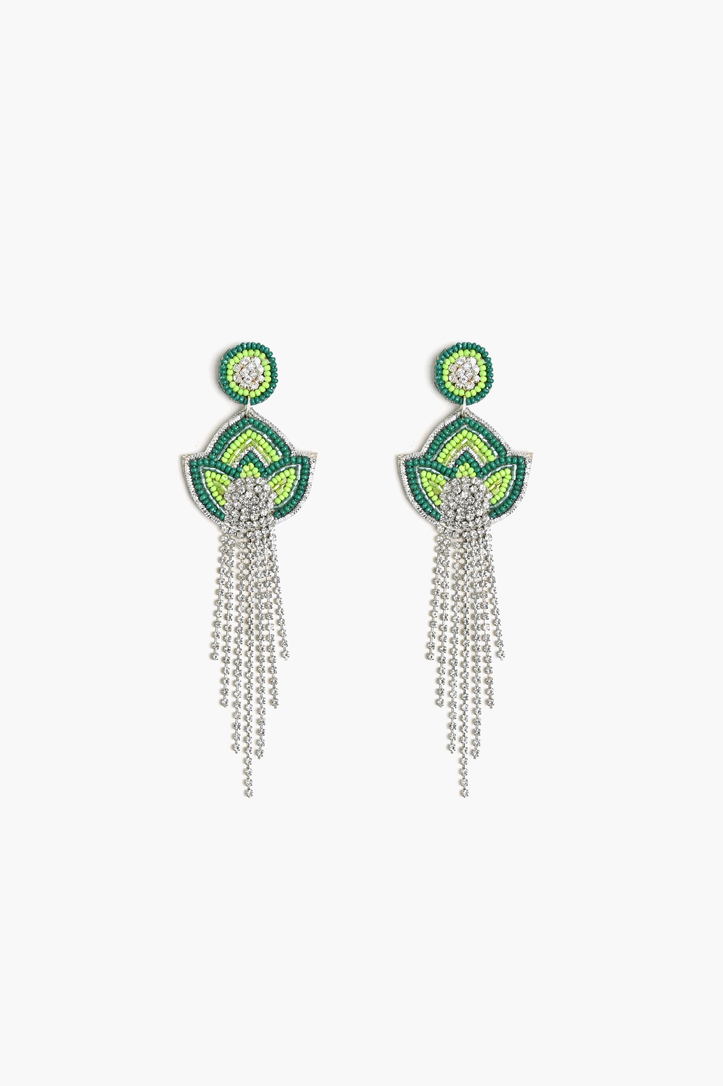 Elevate your evening style with Bohogirl’s Teal & Lime Floral Beaded Earrings. These handcrafted drops feature a detailed botanical design accented with a dazzling crystal center and long, flowing beaded fringes. Combining vibrant colors with sophisticated shimmer, they are the perfect lightweight statement piece for any special celebration.