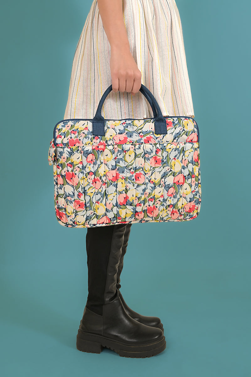 Meet our stunning Tulip Garden Laptop Bag - A perfect blend of fashion and functionality. A beautiful floral design with arrangement of tulips that adds a touch of bohemian charm to your everyday commute. Our Laptop bag features a main compartment that fits your laptop. The zip compartment in the front provides quick access to your essentials, while the small zip pocket inside is perfect for organizing small valuables. A unique heart tuft on the main zip adds a delightful and charming detail. Whether you're heading to the office or a class this handcrafted bag is the ideal choice for the modern woman on the go.