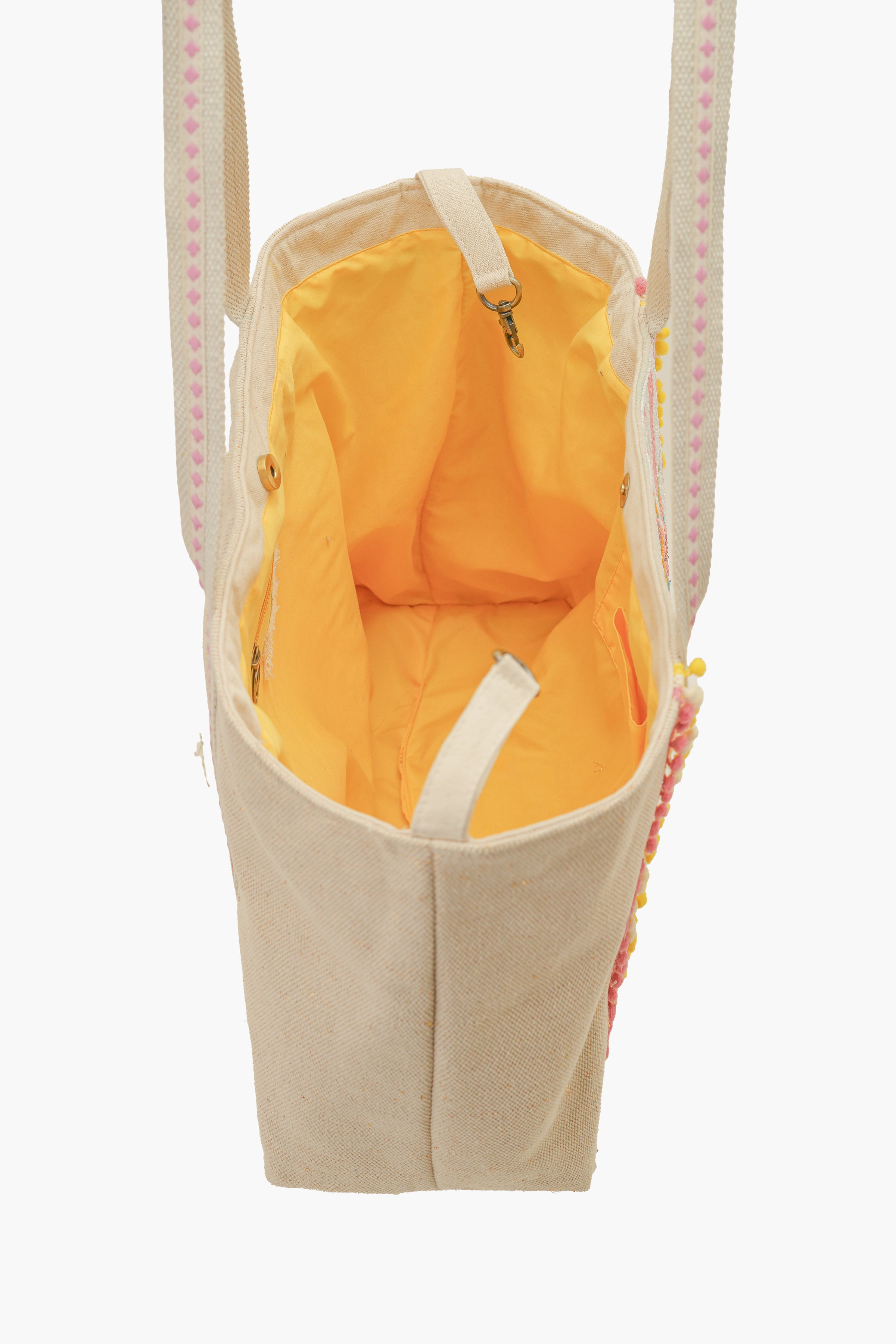 Elevate your wardrobe with your new favorite accessory—the BohoGirl Rose Garden Tote Bag. This bag is a perfect harmony of traditional Indian craftsmanship and modern-day fun. The detailed hand-applied floral beadwork and shimmering gold accents provide a luxurious feel, while the vibrant pom-pom edging adds a playful, 'Boho-chic' vibe.
