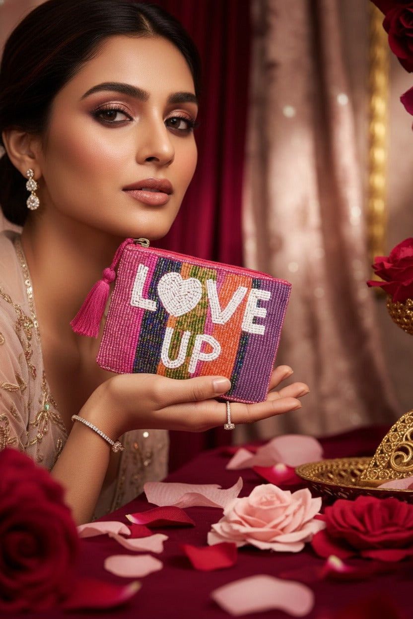 Add a burst of color to your accessory collection with the BOHOGIRL "LOVE UP" Multi-Color Striped Beaded Pouch. This luxury handmade coin pouch is a masterpiece of craftsmanship, featuring vibrant vertical stripes in pink, orange, green, and purple. The centerpiece is a beautifully hand-beaded "LOVE UP" message with a white heart, making it an instant conversation starter.