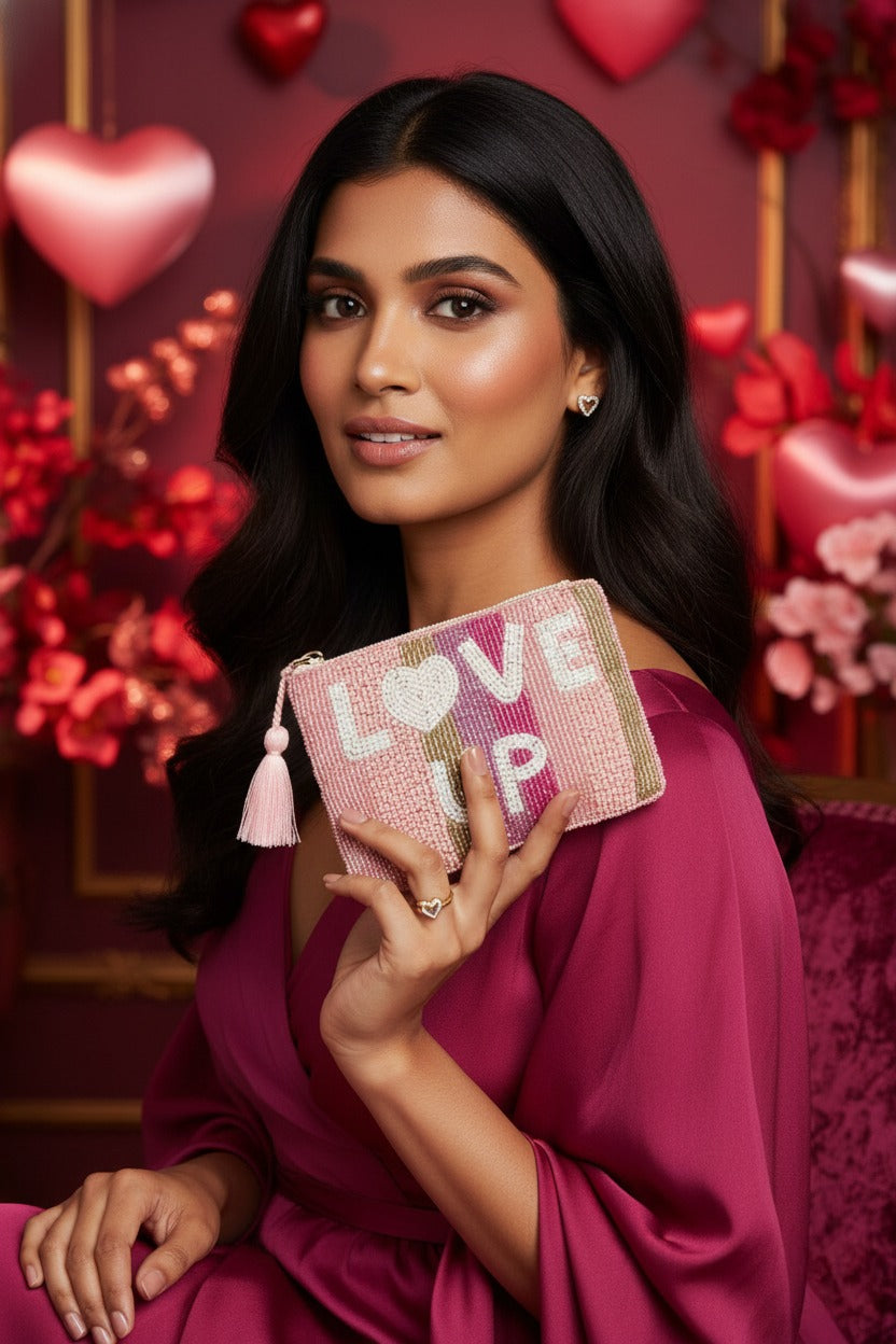 Embrace elegance with the BOHOGIRL "LOVE UP" Pink & Gold Beaded Pouch. This luxury handmade coin purse showcases a sophisticated palette of soft pink, blush, and shimmering gold stripes, all meticulously hand-beaded to perfection. The iconic "LOVE UP" message with a white heart centerpiece adds a romantic and playful touch to this high-fashion accessory.