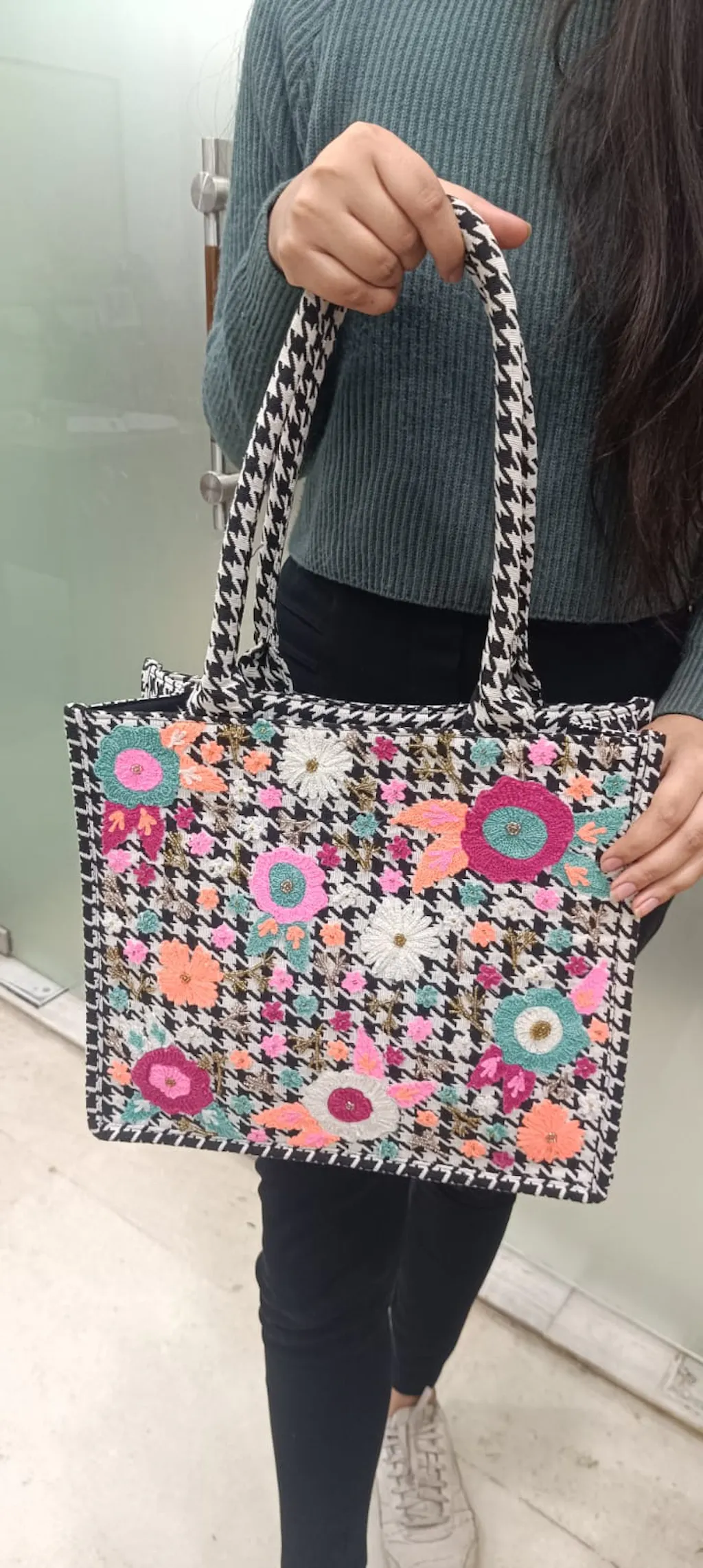 The Boho Girl Black & White Tote is a stylish and spacious accessory perfect for women and girls. With its timeless black and white design, this tote is versatile for casual outings, evening events, or as a college bag. The bag is beautifully adorned with colorful embroidery, adding a vibrant boho touch to its elegant look. Equipped with a magnetic button closure, the tote ensures easy access while keeping your belongings secure. Inside, it offers extra inner space along with a zipper pocket for organizing essentials. A back pocket adds extra storage and convenience, making it practical for daily use. This college tote combines style, functionality, and ample storage space, making it an ideal choice for modern women on the go.