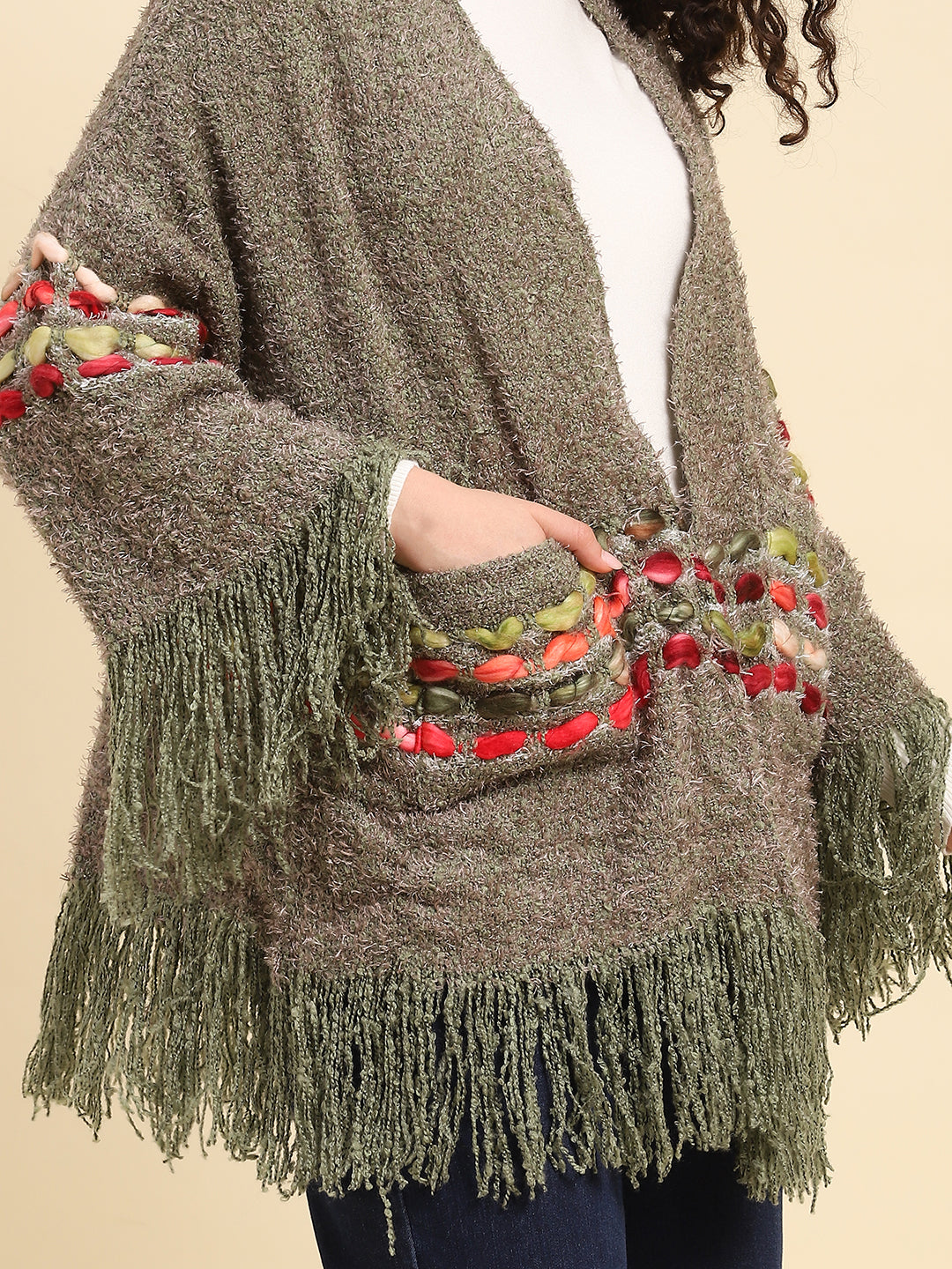 - Olive Green Fringed Sleeves Shrug